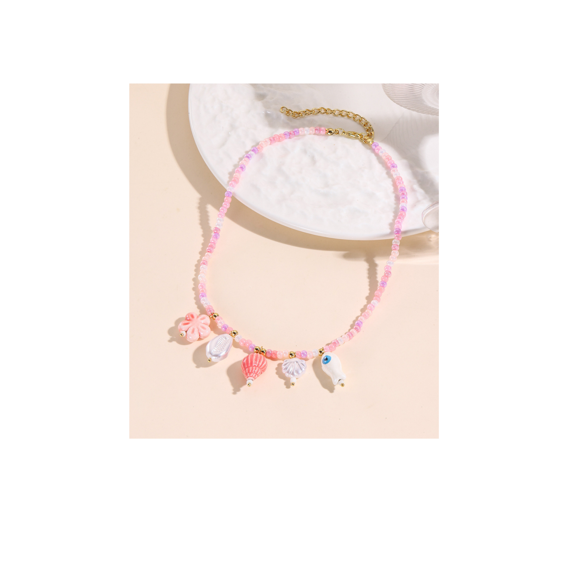 Collier composé de perles acryliques roses et de breloques fantaisie inspirées de l’univers marin.